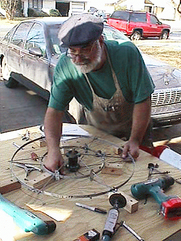 Inner and outer bands were made from 1/8 in. X ½ in. flat cold rolled steel, spokes from 5/32 round cold rolled, with 8-32 threads on both ends. Those compound angles for the 12 spokes on the hub were quite challenging and were done freehand…get to know a machinist! Drill and tap them 8-32 for the spokes. Sails and ribs are .023 galvanized sheet. A scroll saw worked best for cutting out those 18 sail ribs – figure one blade will last for 2-3 ribs. Use square nuts for authenticity if you can find them – most bolt houses should be able to get them in sizes up to 10-24. True the wheel just like you do a bicycle wheel – having a nut on both sides of the outer rim makes it easy (well, sort of…) Mine ended up within 1/32 in. both in concentricity and run out...after 2-3 hours of truing it, I decided that was close enough! Use a thread locking compound on ALL nuts and screws (I like the red Permatex/Locktite Industrial High Strength ThreadLocker #81791) – to prevent wheel parts from flying all over the neighbors' yards.
